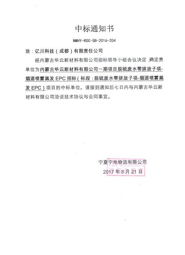 在內(nèi)蒙古華雲新材料有¶∑(yǒu)限公司一(yī)期項目脫硫廢水(shuǐ)零排放(fà$γng)子(zǐ)項-煙(yān)道(dào)噴霧蒸發EPC≥π€✘項目中,我公司憑借雄厚的(de)技(jì≠&•×)術(shù)力量、豐富的(de)工(gōng)程經驗、良好(hǎo§>≥ε)的(de)市(shì)場(chǎng)信譽在衆多(duō) ¥α競争對(duì)手中脫穎而出,一(yī)舉奪魁。此項目的(de)πε¶中标,再次奠定了(le)我公司良好(hǎo)的(de)發展趨勢。