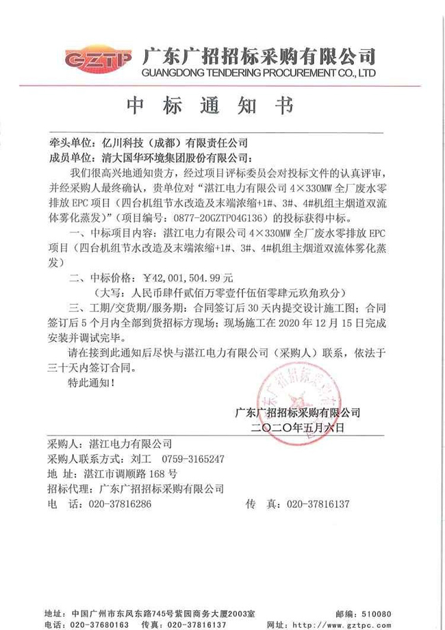 2020年(ni™↕án)5月(yuè)6日(rì),我公司成功中标廣東(dōng)能<ε♠β(néng)源集團粵電(diàn)湛江電(diàn)力有(yǒu)限公司4γ•¥×330MW全廠(chǎng)廢水(shuǐ)零排®↕★放(fàng)EPC項目。